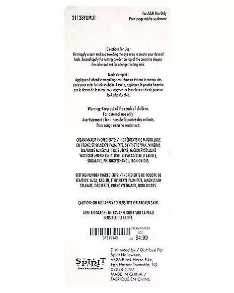 Get the perfect spooky look with this black cream makeup and setting powder. You’ll easily get just the look you desire whether you want to be a vampire, wolf, clown or any other creature when you apply this easy-to-use makeup and setting powder. Transform yourself this Halloween so that no one will recognize you.