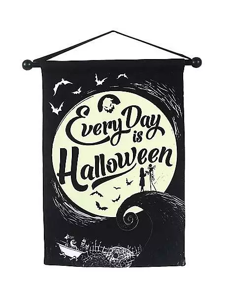 Every day is Halloween! This officially licensed The Nightmare Before Christmas scroll sign features Jack and Sally surrounded by the light of the moon and (of course) Oogie Boogie. Hang this scroll sign in your space to spread the spooky spirit!