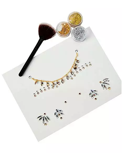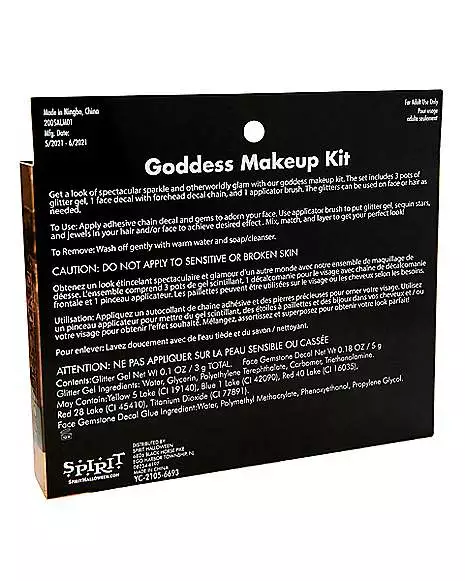 Achieve a spectacular style with this sparkling goddess makeup kit. This glam set includes 3 small pots of glitter gel that can be used on both skin and hair using the included applicator brush. A face decal with a forehead chain adds stunning shine to your look!