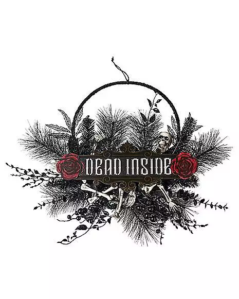 Welcome your guests with this spooky decoration! This black wreath features skeleton details, and a sign that reads “dead inside.”