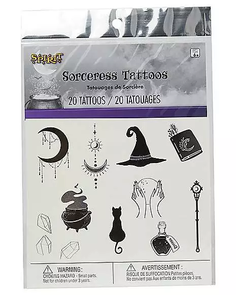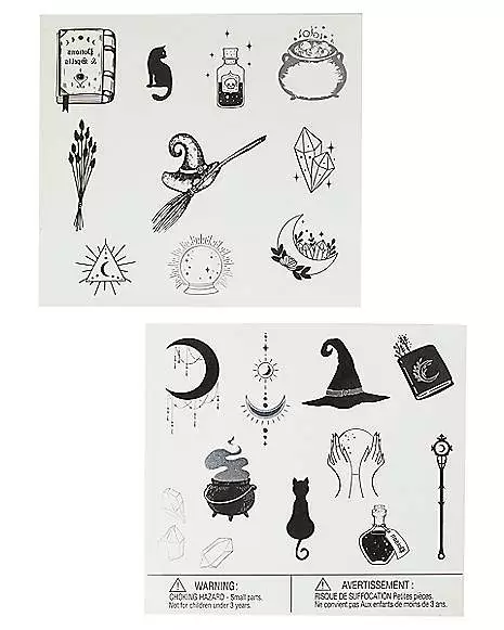 Embrace your witchy side with these kids’ sorceress tattoos! This temporary tattoo pack features an assortment of 20 black and silver witch-inspired graphics, including witch hats, black cats, moons, and more.