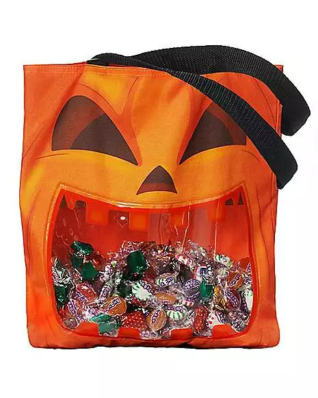 Keep track of all your goodies on Halloween night with this spooky tote bag! This tote bag features a smiling jack-o-lantern whose open mouth reveals all the candy you’ve collected throughout the night. Try to fill the pumpkin’s mouth all the way to the top when you go trick-or-treating this Halloween!