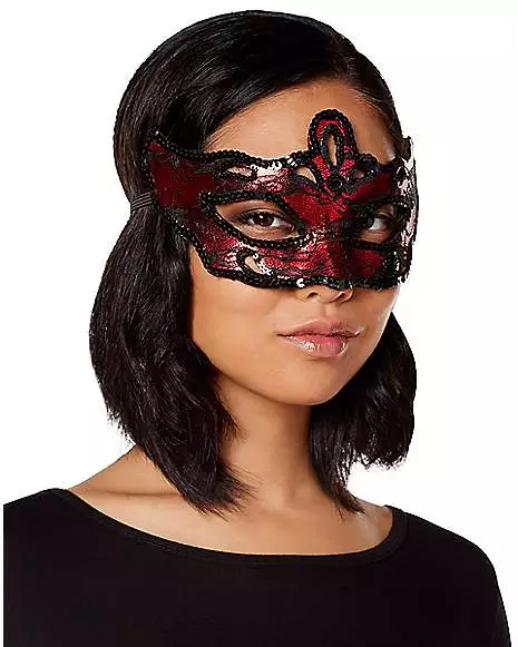 You’ll be the most mysterious beauty at the party in this stunning red and black eye half mask. Adorned with shiny black sequins and delicate lace, this mask is the perfect romantic accessory.