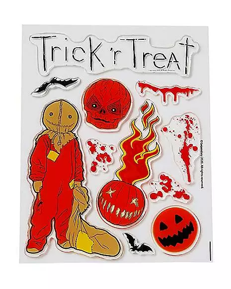 Get ready for the thrills and chills of Halloween with these Sam Trick ‘r Treat Gel Clings! This pack of gel window clings features two sheets of stick-on decorations for a total of 26 Sam-approved graphics. Sam’s Halloween rules, blood stains, and bats are just a few of the dazzling decorations included among these Trick ‘r Treat gel clings!